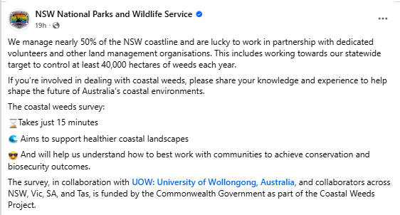 Researchers from University of Wollongong have been contracted by NSW National Parks and Wildlife Service with funding from the Commonwealth Government to investigate how coastal weeds are currently being managed across Australia, understand what best practice partnerships look like, and identify the existing research needs of stakeholders.