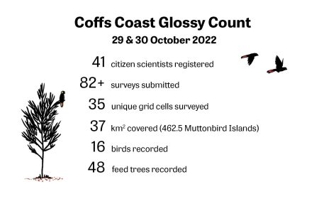 As part of this project we recently supported BirdLife’s Coffs Coast Glossy Count by assisting with promoting and running their two training workshops prior to the Count on the last weekend in October. Thank you to all of our Landcarer’s who participated in both the workshops and the Count. A summary of the outcomes of the Count has just been provided by Birdlife. It was great to see that a number of actual birds were spotted during the count.